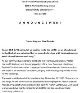 New Covenant Missionary Baptist Church, at 2540 N. Martin Luther King, OKC, invites other congregations to join in an afternoon of worship, giving thanks to God at 3 p.m. on Saturday, November 22.